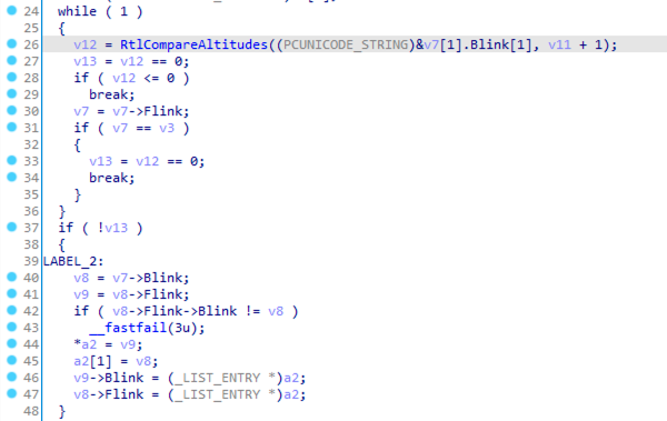 其 v16 参数则表示一个 CALLBACK_ENTRY_ITEM,其传入 ObpInsertCallbackByAltitude 函数,该函数根据 Altitude 的值排序并将回调函数插入到 OBJECT_TYPE->CallbackList 这个双向循环链表中,如下: