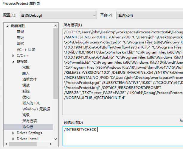 由于 windows 对 ObRegisterCallbacks 的调用强制要求数字签名,我们需要在项目链接器中添加 /INTEGRITYCHECK 参数(否则调用 ObRegisterCallbacks 时将返回 0xC0000022 错误),如下: