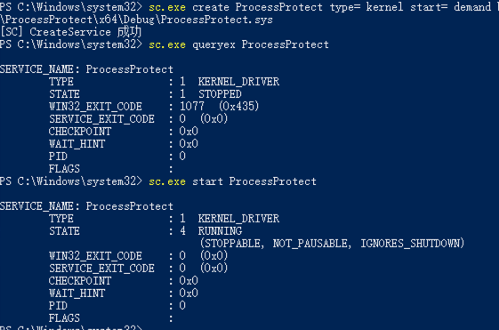 sc.exe create ProcessProtect type= kernel start= demand binPath= C:\Users\john\Desktop\workspace\ProcessProtect\x64\Debug\ProcessProtect.sys